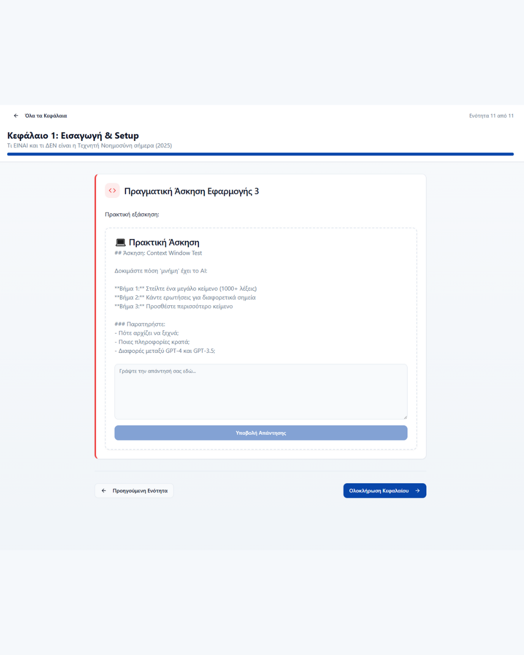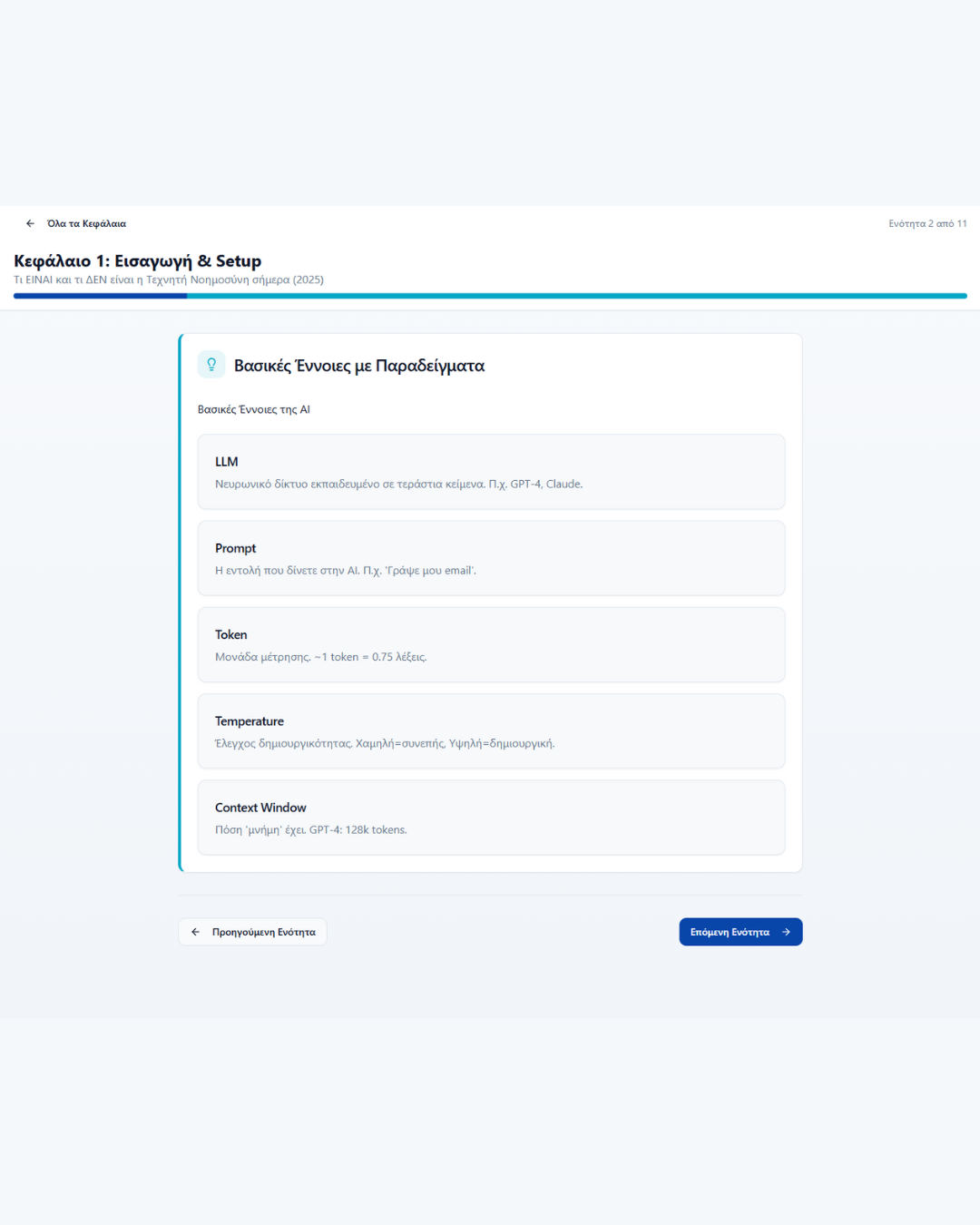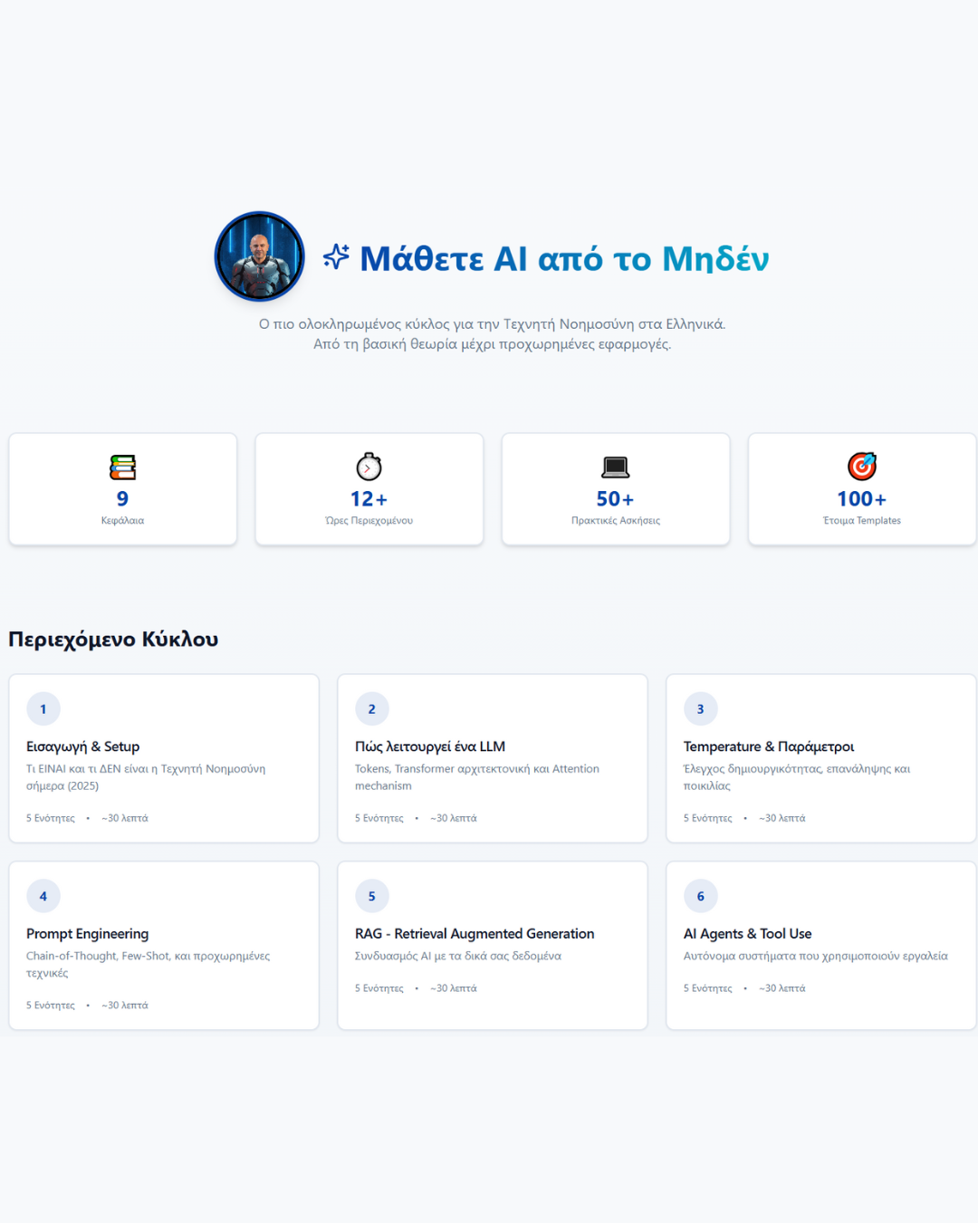 Module 1 – Εισαγωγή & Setup Module 2 – Πώς λειτουργεί ένα LLM Module 3 – Temperature & Παράμετροι Module 4 – Prompt Engineering Module 5 – RAG – Retrieval Augmented Generation Module 6 – AI Agents & Tool Use Module 7 – Fine-tuning & LoRA Module 8 – Multimodal AI Module 9 – Ηθική, Νομικά & Ασφάλεια